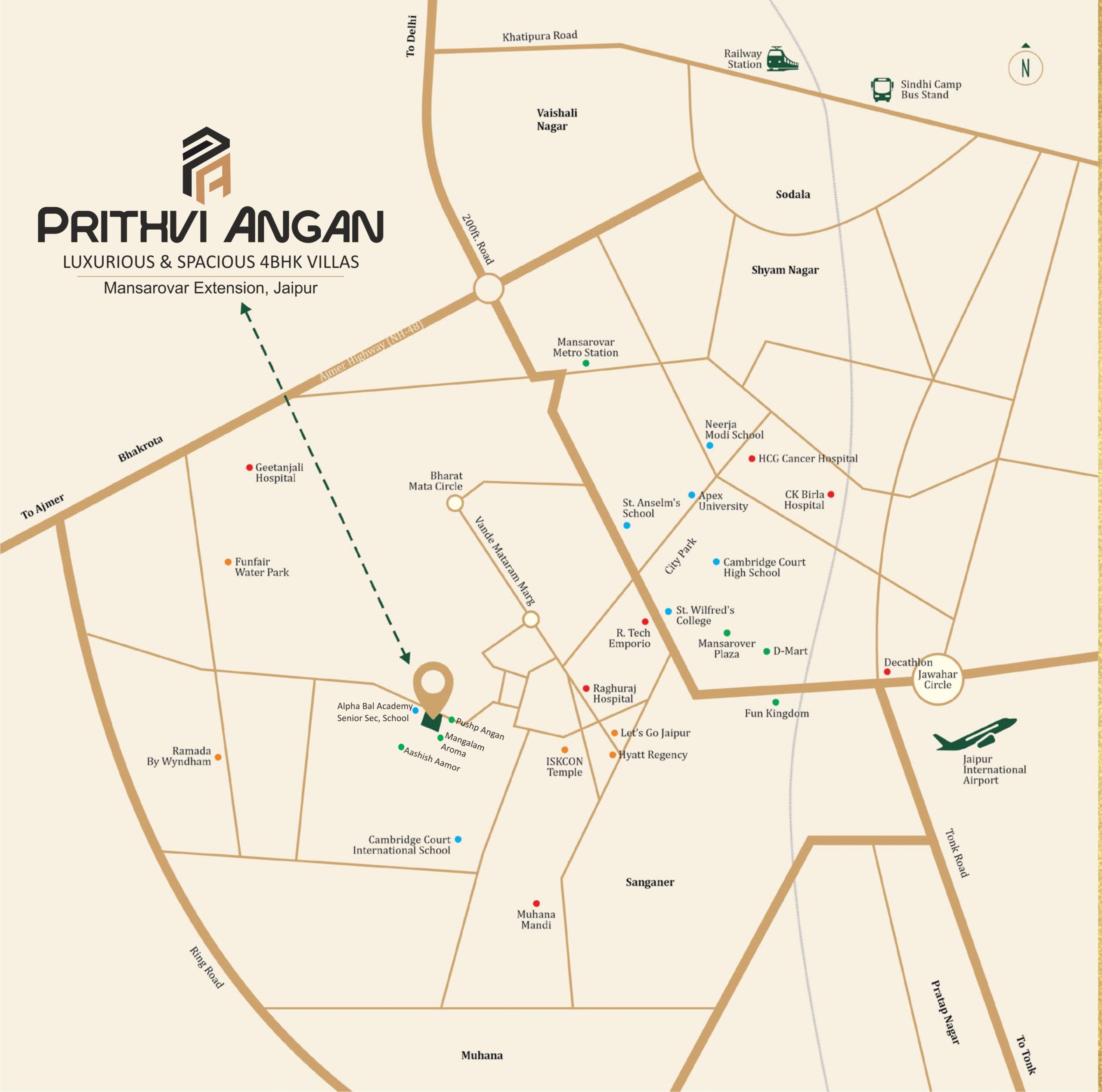 Situated in a prime residential area, Prithvi Angan Villas offers a balance of connectivity and suburban calm. Located near major hubs like Ajmer Road, Ring Road, and Patrakar Colony Road, Prithvi Aangan offers excellent connectivity to key landmarks including Iskcon Temple , Hyatt Hotel, City Park, Jaisinghpura and Top Residential Zones.